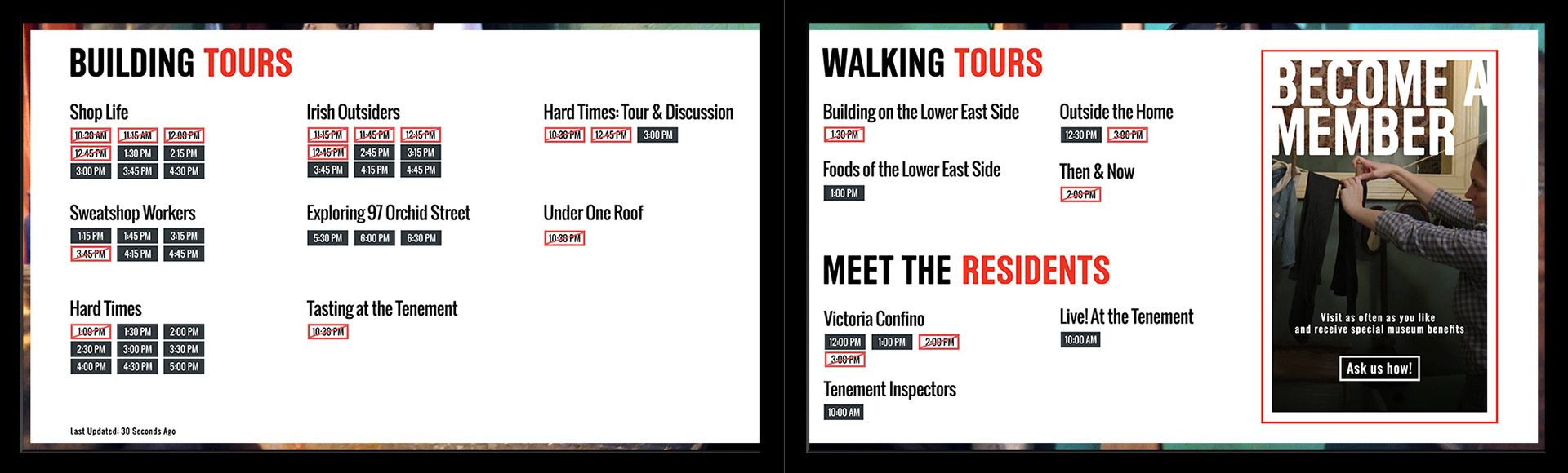 Signage Refresh of the ticketing information signage. Times update in realtime based on availability and ticket sales.